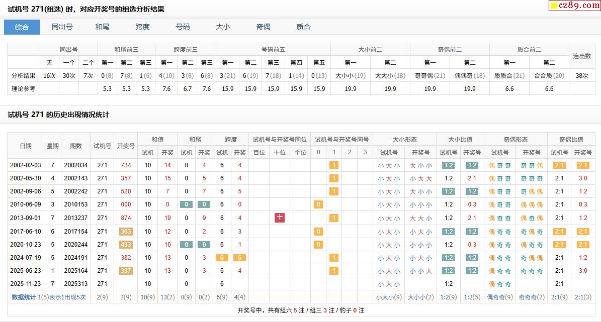 313期福彩3D试机号271对应开奖号的组选分析结果